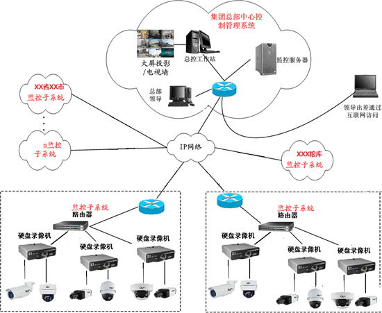 在XXX粮食系统的北京总部建立一套视频监控平台,通过移动光纤专线直接连接(或者原有网络)各分支的DVR。每个监控点的图像通过摄像头等信号接入DVR,在通过网络再连到中心服务器上进行存储、管理等处理。