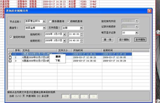 点击“查询”按钮就能搜索到要回放图像的列表。在录像列表文件上点击鼠标左键出现“播放”和“下载”按钮。