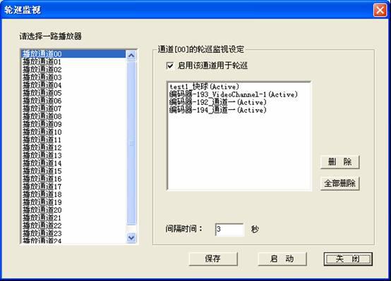 在工具栏的“视频”菜单中选择“视频轮巡/轮巡配置”,打开视频轮巡设置窗口,如下图所示: