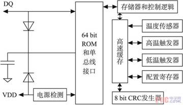 在进行多点测温时,由于传感器与数据采集系统有一定的距离,电磁干扰、信号衰减等问题会造成数据传输错误。DS18B20内部提供CRC 冗余校验码,传输过程中系统具有一定的容错能力,在纠错范围内,就可以对错误的数据进行纠正, 提高抗干扰能力和加大传输距离;当错误超出纠错范围时,也可以识别出错误的数据进行重新采集,从而提高采集数据的可信度。DSl8B20的内部结构图如图1所示。