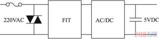 电源部分电路如图4 所示。电源输入电压为220 V交流电压, 输出为+ 5 V 电压, 直接供给单片机使用, 图3中的稳压管用于抑制雷电和操作过电压干扰, FIT是交流干扰抑制滤波器, 用于进一步降低电源干扰, AC /DC 是开关型直流稳压电源, 为监测站提供直流电源; 电容器具有滤波作用。