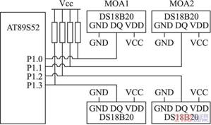 监测站以AT89S52单片机作为控制器, 通过多个数字式温度传感器DSl8B20对三相MOA和环境温度进行采样, 送往单片机同时进行数据处理。此单片机通过RS- 485总线与PC 机进行通信, 实时传送当前的三相MOA 温差和工作状态标志, 并按照要求发送或接收参数的设定值。本设计中四路温度传感器分别测量一组监测站中三个MOA底部接地端子温度和环境温度。单片机对采集来的温度数据进行处理判断, 并将判断的MOA 当前工作状态存储, 等待监测计算机的读取, 实现基于温度的MOA 在线监测。