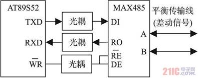 本设计选用的单片机AT89S52 具有一个全双工的串行口, 可以通过编程设定为4种工作方式, 完全满足系统的串口通信要求。由于实际的温度测量系统离PC机的监控地点较远, 如采用常用的RS-232串行通信接口在传输距离短, 信号易受干扰等缺点, 因此本设计选用了RS- 485总线进行远程通信。RS - 485是美国电气工业联合会制定的通信标准, 其采用差分信号进行传输, 最大传输距离约为1219 m, 最大的传输速率可达10Mbit/ s, 能够满足长距离和高速率的串行异步通信, 得到了广泛的应用。在系统实现中, 单片机端使用MAX485芯片将TTL 电平转换成RS - 485的电平输出, 并在PC端连接RS232 /485转换器, 从而实现了远程监控。RS- 485总线接口电路如图6所示。