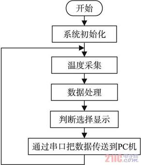 软件部分主要包括主程序、RS - 485 通信、键盘扫描、温度采集、温度显示等部分组成。其中RS -485通信模块主要完成和PC 机的通信; 键盘扫描模块用来输入各温度传感器的温度上下限; 温度采集模块定时的采集四个温度传感器的温度值; 温度显示模块用来循环的显示三相MOA与环境的温度差。