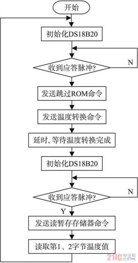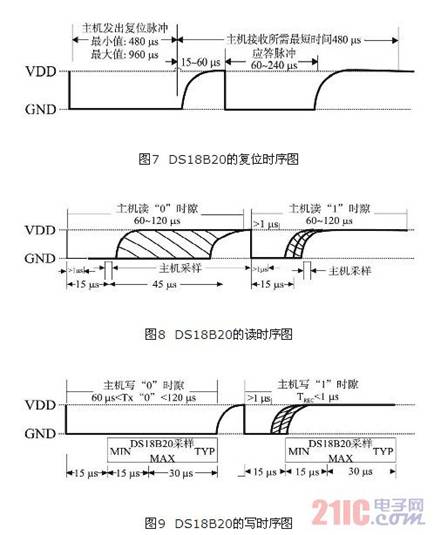 由于DS18B20采用的是1-W ire总线协议方式,即用一根数据线实现数据的双向传输, 单线通信功能是分时完成的, 有严格的时序概念, 因此读写时序很重要。系统对DS18B20的各种操作必须按协议进行。操作协议为: 初始化DS18B20(发复位脉冲)-发ROM 操作命令-发存储器操作命令-处理数据。